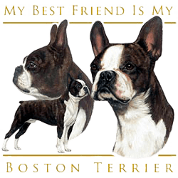 Brag about your four-legged friend with one of these Boston Terrier cotton shirts. We offer a nice variety of sizes and colors, and you can get sweatshirts also for those cooler days. The image on the Boston Terrier t-shirts measures 11 inches square so it's beautifully eye catching. Don't be surprised if others come up to you when they see your cute shirt and want to talk about your favorite breed. The Boston Terrier shirts make a wonderful gift, so don't forget to order extras.