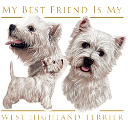 The West Highland Terrier t-shirts are here to stay. When your dog is your best friend, there's no better way to say it than by wearing our premium weight Westie cotton t-shirt. It features the breed in three poses so everyone can see that amazing Westie cheer, everywhere you go. You're bound to attract your share of attention when you dine out in one of our West Highland Terrier shirts. Everyone loves the cut and fit of our comfy Westie t-shirts and now this 11 x 11 inch design is available on sweatshirts too. Just select your choice below.