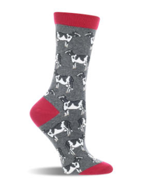 "Step into the whimsical world of the farmyard with our black and white cow socks - a moo-velous addition to your wardrobe that's sure to make every day 'udderly' enjoyable!" you will comfort your tootsies with these amusing Cow Socks. Various white and black cow images are printed on a grey background, and they may bring a giggle or two to your friends in the office or on the bike path. Our Cow Sock is available in ladies' sizes 9-11. comfy blend of 65% Cotton 20% Polyester 12% Nylon 3% Spandex,