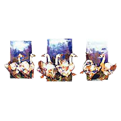 Our Geese Shirt is emblazoned with an impressionistic image of prancing and dancing geese. Purple and blues hint at the natural world while cream and wheat colored geese lift their feet in a multitude of poses. Our Goose Shirt is ideal casual Friday wear, bringing art and whimsy into the workplace. Our merchandise is premium weight, durable, and guaranteed. The 11 x 5 inch picture is printed on the front of the shirt. We also offer Geese Sweatshirts in several colors and sizes, perfect for early morning feeding chores in the kitchen or in the barnyard.
