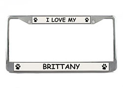 Show your love for this good-looking bird dog with a Brittany Spaniel License Plate Frame mounted on your car, truck or camper. Constructed of sturdy chrome metal, our Brittany License Plate Frame measures approximately 6 x 12 inches. No matter if your Britt's coat is orange and white or dabbled with brown, this floppy-eared hunter deserves the special tribute on our License Frame. Our Brittany License Plate Frames make outstanding gifts for any occasion. Put on the dog and smile while you drive!