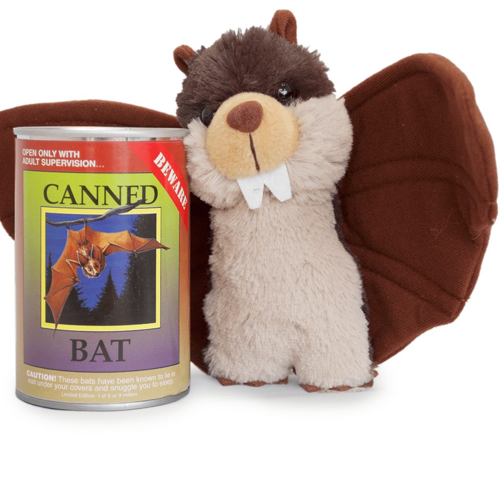 One soft, furry Bat stuffed animal is packaged in this sixteen-ounce can! It can describe the life of the Bat, tells about its preferred environment, and much more about this species! This Bat in a can is enjoyable, informative, and it's canned in the USA.