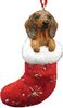 With our Dachshund (Red) Christmas Ornament, make every holiday one that celebrates furry family members. Put this Dachshund Christmas Ornament on your tree to give it a touch of personal pet fun, or give it to a dog loving friend or family member. Bright gold snowflakes and clear sparkling beads accentuate the soft red felt stocking. These fabulous Tree Ornaments are a beautiful salute to this wonderful breed. Give these wonderful Dachshund Christmas Ornaments, which come in their own gift box to any loved one and watch their face light up. Each of our Dachshund (Red) Christmas Ornaments is approximately 3.5 X 1.5 inches and comes with a red ribbon to hang from the tree. This is one ornament that they'll want to keep in their family for generations.