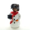 With a bright red scarf, black top hat, button front and the signature carrot, this adorable Uncropped Doberman Pinscher ornament will undoubtedly be a family favorite for years to come. This Snowman is realistically sculpted, cast in quality stone resin and meticulousy hand painted for the true dog lover. The perfect gift for Uncropped Doberman Pinscher fans and a fun way to include your pets in the christmas holiday. Because of the weight, this decoration is not meant to be hung from a Christmas Tree. The snowman measures approximately 5.5" tall and weights 13 ounces.