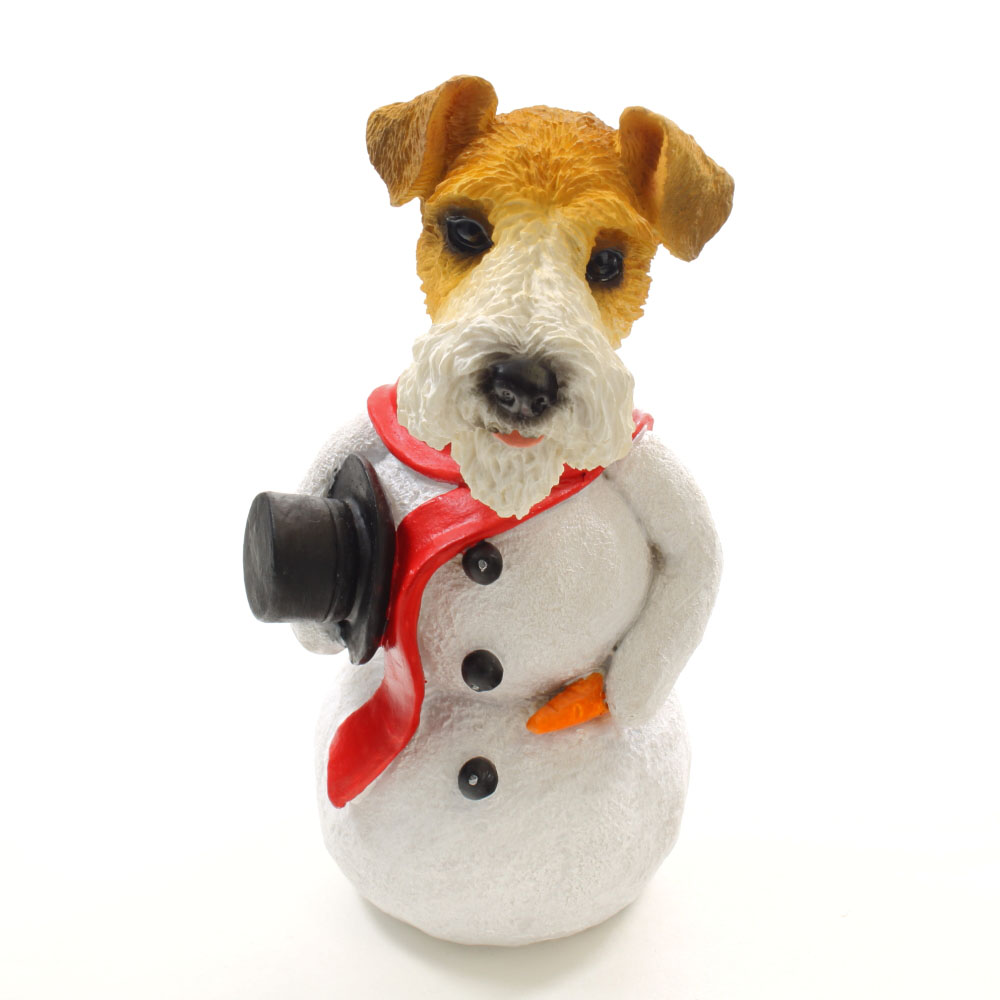 With a bright red scarf, black top hat, button front and the signature carrot, this adorable Fox Terrier ornament will undoubtedly be a family favorite for years to come. This Snowman is realistically sculpted, cast in quality stone resin and meticulousy hand painted for the true dog lover. The perfect gift for Fox Terrier fans and a fun way to include your pets in the christmas holiday. Because of the weight, this decoration is not meant to be hung from a Christmas Tree. The snowman measures approximately 5.5" tall and weights 13 ounces.