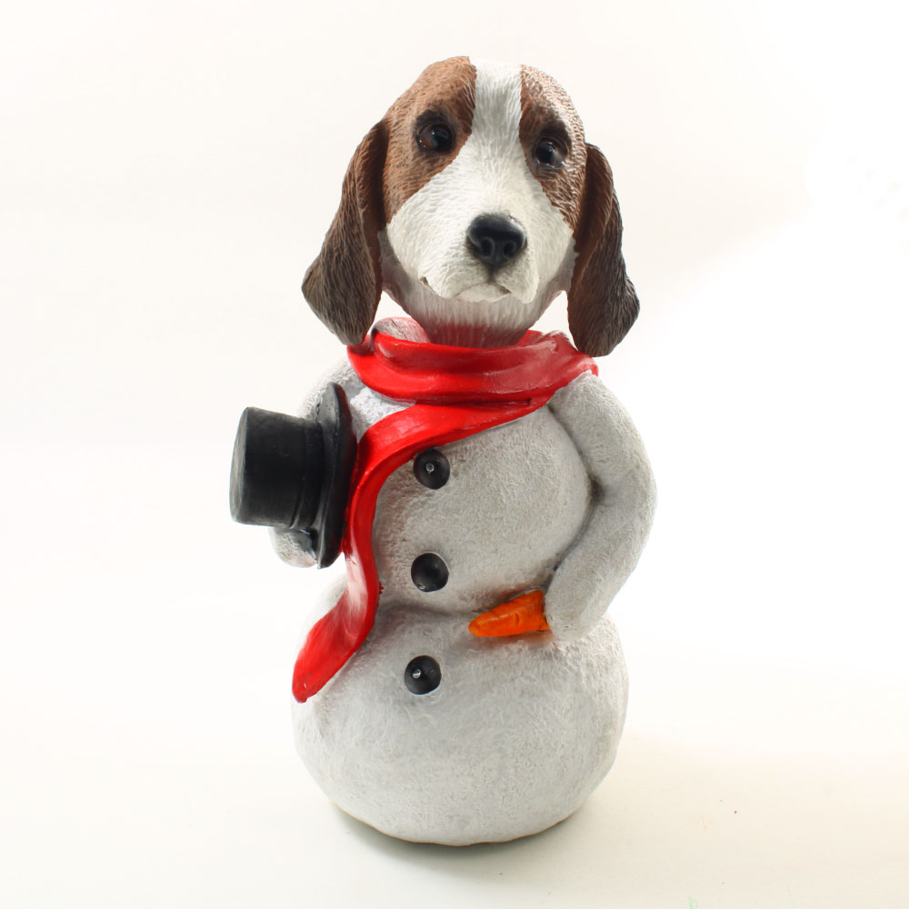 With a bright red scarf, black top hat, button front and the signature carrot, this adorable Foxhound ornament will undoubtedly be a family favorite for years to come. This Snowman is realistically sculpted, cast in quality stone resin and meticulousy hand painted for the true dog lover. The perfect gift for Foxhound fans and a fun way to include your pets in the christmas holiday. Because of the weight, this decoration is not meant to be hung from a Christmas Tree. The snowman measures approximately 5.5" tall and weights 13 ounces.