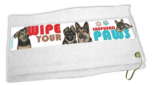 Impressive and intelligent, take care of your fearless friend well with the wonderful German Shepherd Paw Wipe Towel. He will positively shine on a 13 x 18.5 inch when fully opened, White Terry Cotton Towel custom made with Grommet & Hook and delightful depiction of this amazing German breed. Machine Washable and luxurious, the German Shepherd Paw Wipe will command the attention of everyone in the room.