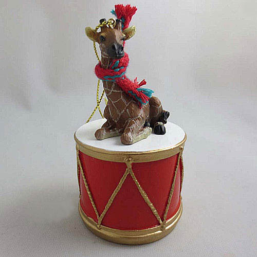 I love giraffes, but how do you mix them in with Christmas? Animal Den figured out how to do it. This well-made, quality ornament of a baby giraffe resting on a Christmas-style drum and wearing a fabric red and green scarf is just the perfect addition to our Christmas Tree. Thanks, Animal Den!
