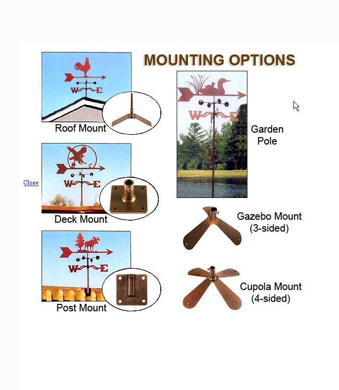 Our Mallard Duck Weathervanes create a fantastic display when pole-mounted in a garden, but can also be attached to any post or deck railing or roof-mounted on your house, cupola or shed. The top is approximately 21 inches wide by 8 - 11 inches tall. The wind cups and direction indicator section is 15 inches across. For your convenience, this Mallard Duck Weathervane comes complete with your choice of garden, post, deck, or rooftop mounting hardware. The Garden Stake is 60" high and the Deck Mount is 15" high and attaches to any horizontal surface with a 3" x 3" mounting plate.