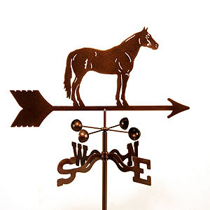 Our Quarter Horse Weathervanes create a fantastic display when pole-mounted in a garden, but can also be attached to any post or deck railing or roof-mounted on your house, cupola or shed. The top is approximately 21 inches wide by 8 - 11 inches tall. The wind cups and direction indicator section is 15 inches across. For your convenience, this Quarter Horse Weathervane comes complete with your choice of garden, post, deck, or rooftop mounting hardware. The Garden Stake is 60" high and the Deck Mount is 15" high and attaches to any horizontal surface with a 3" x 3" mounting plate.