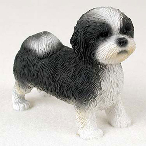 This beautiful Shih Tzu Black & White Puppy Cut Figurine is made of stone resin, is hand painted with absolutely stunning detail and measures approximately 4"-5" across its longest side.